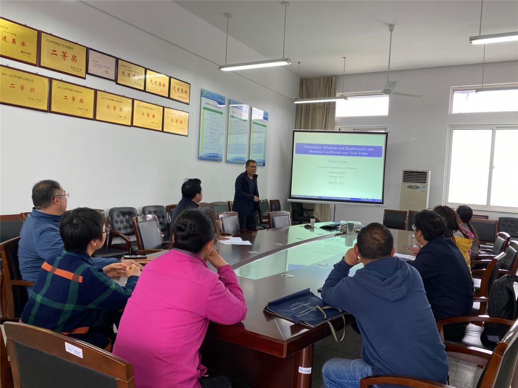 施敏加教授做了题为《有限域上具有非平凡系数的置换三项式和四项式》的学术报告。施敏加教授首先介绍了双DT码在编码理论中具有重要的研究价值。他重点阐述了如何用Dickson多项式显式地确定谱,并且推导出生成LCD码的条件,并利用一种特殊的级联过程,构造了扩展域上DT码的二元和三元LCD码的最优或准最优例子。