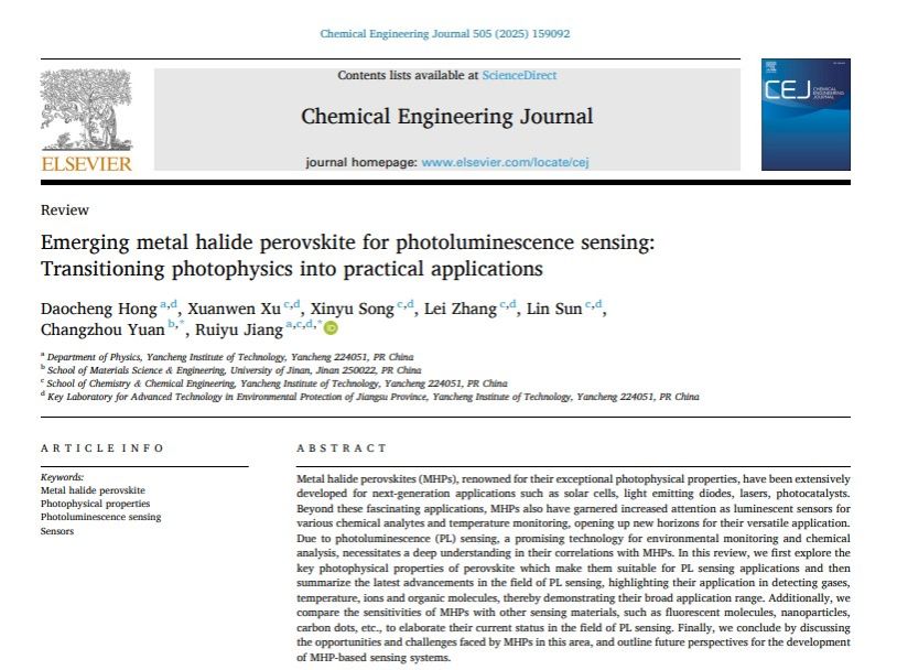 近日,公司洪道程博士(第一作者)和姜瑞雨教授(通讯作者)与济南大学原长洲教授合作,PA视讯官方网站第一单位,在化工领域TOP期刊《Chemical Engineering Journal》(IF = 13.4)上发表题为“Emerging Metal Halide Perovskite for Photoluminescence Sensing: Transitioning Photophysics into Practical Applications”的学术论文。